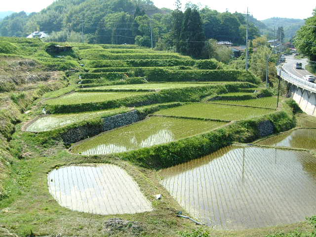 「棚田」の風景。中山間地、平野と山岳地帯の中間に位置する。都会の人たちにとって、段々状になった不定形の田んぼの景色にたまらなく魅かれるらしい。自然のかたち、等高線(コンタ)状につくられた田んぼに、ほのぼのとした郷愁を覚える。「棚田」の風景を残して大事にして欲しいという声がかなり聞こえるようになった。 鎖国から開放された日本の風景を見て、手入れの行き届いた農業をまさに「庭園」だと感嘆したという。山を背景にして、綺麗に丹精を込めて植え付けられた田植え、そして秋になり一面の黄金の穂がなびく田園風景は、イギリスと較べて美しい「庭園」そのものであった。今、田んぼに水が張られ、田植えの時季も終わろうとしている。緑のじゅうたんへと変わりつつある。 ‘圃場整備’。生産性を上げ、後継者不足の中、機械化農業に向けて全国各地で土地改良事業が行われてきた。耕作者の要望を聞きながらの工事なので、一般の土木工事と違って作業は大変だ。農地の入れ換え、換地も伴う。機械化農業への脱皮を目指して、合理的、機能的な田んぼにかたちを変えるために、四角い、大きめの田んぼの組み合わせがつくりあげられる。北海道から九州まで機能的な、整然とした田園風景が出来上がる。 四角の田んぼのコーナーはやはり手植えに頼らざるを得ない。「まあるい田んぼ」不定形にしても利点はある。定規のないかたちだから、工事と設計は益々大変になるが、不定形になった途端、あぜ道はくねくねし出す。裏返して考えてみると、農作業の人たちにとってくねくねした間に出来る無駄なフリースペースも、植栽したりして休憩時のポケットパークになるかも知れない。植栽されたポケットパークがランドマーク(目印)として活きてくる。単純な直線の移動より体で覚えて毎日の作業は単調でなくなる。自然のかたちに合わせる、環境にやさしい土木工事、親水護岸、ほたる水路、木の水路など、かなり実施されるようになってきた。技術者もセンスがなければ、定規がない分大変だ。都会の人たちが憧れる、不定形の「まあるい田んぼ」もつくられるようになるかも知れない。