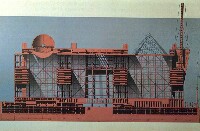 磯崎新が初めて発表した「空中都市計画」(新宿)が暗示する都市の姿が印象的だ。都市の変貌を強いインパクトで働きかけてくる。磯崎新はこの計画をのちに『「廃墟の都市」と呼んだモンタージュが生まれました。ここには、私にとってその後の全仕事にかかわる「対立」の手法が、数多くのメタファーを生む手掛りとして使われています。未来と過去、新と旧、秩序と崩壊、建設と消滅、量的なものと線的なもの、これらが理不尽な接合をしています。』Jとコメントしている。