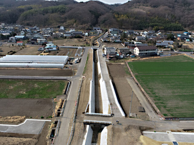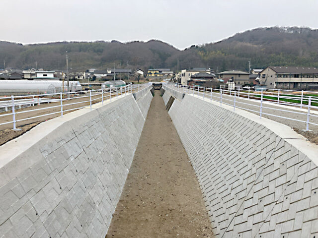 工事概要 烏川右岸12.6k付近の井戸沢川の護岸工事。ブロック積A=414m2、コンクリート擁壁L=189m、防護柵工L=291m